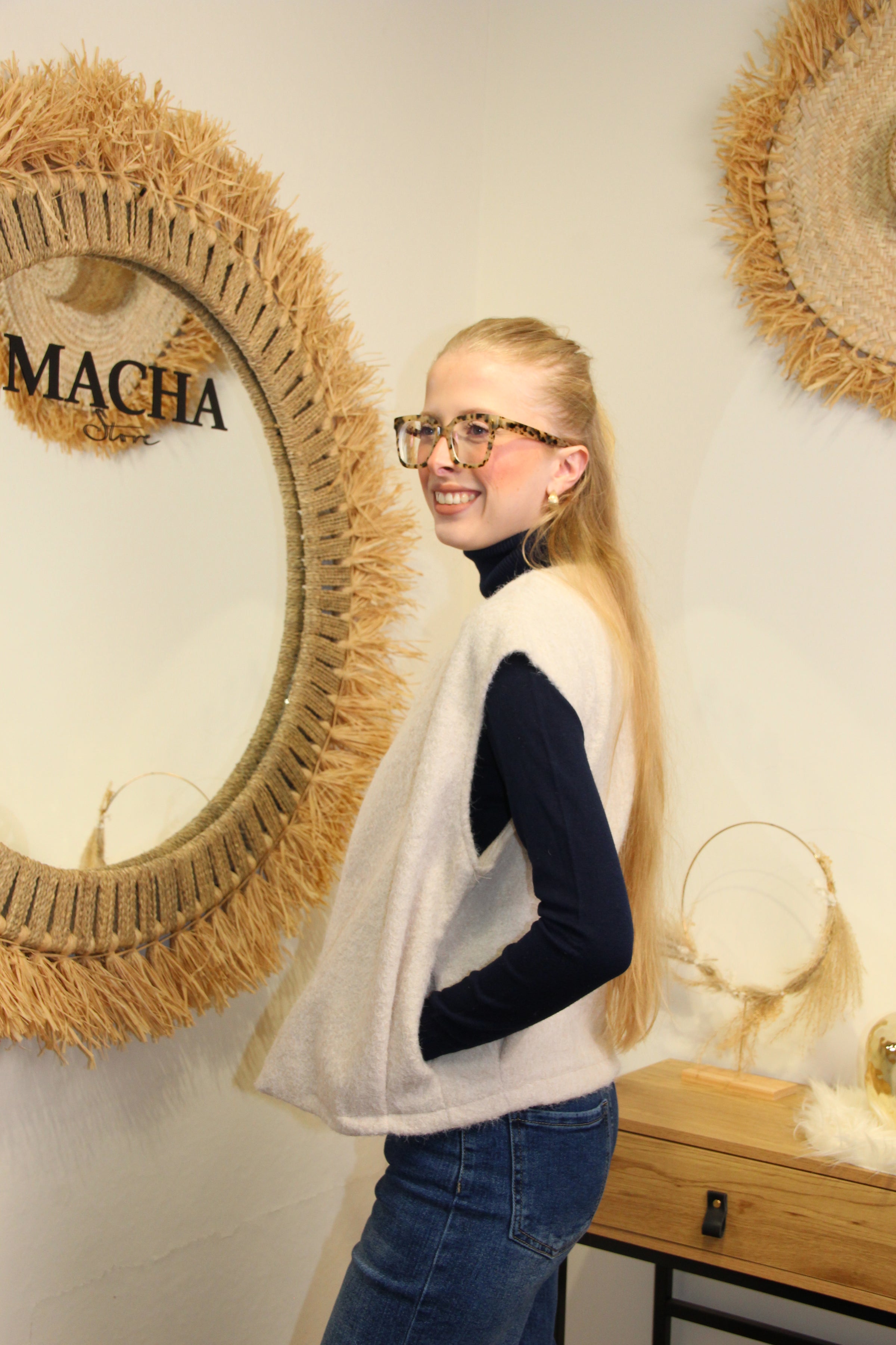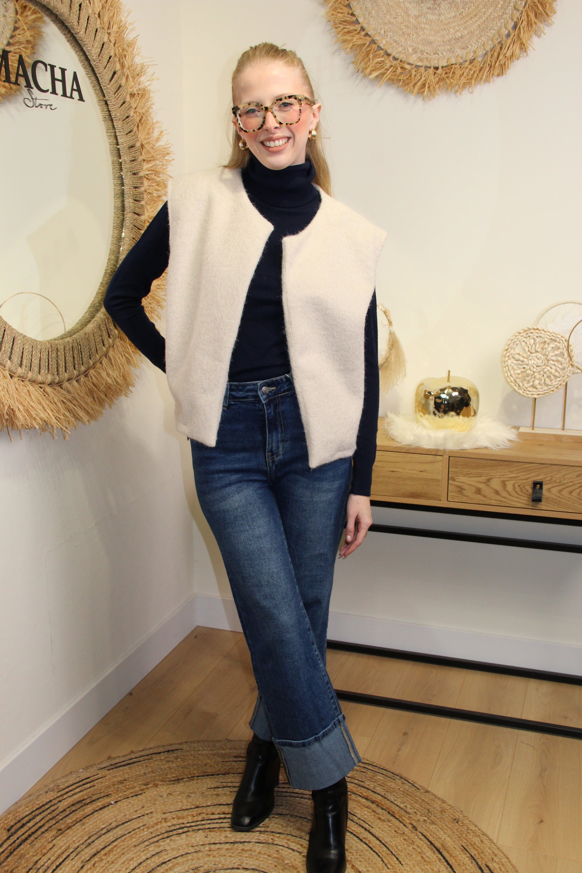 Le gilet Naya écru est la pièce parfaite pour réchauffer vos looks avec douceur et élégance. Sa teinte claire et lumineuse s’accorde facilement avec vos tenues hivernales. Sans manches, il se porte ouvert pour un style casual chic, en superposition sur un pull ou une chemise.