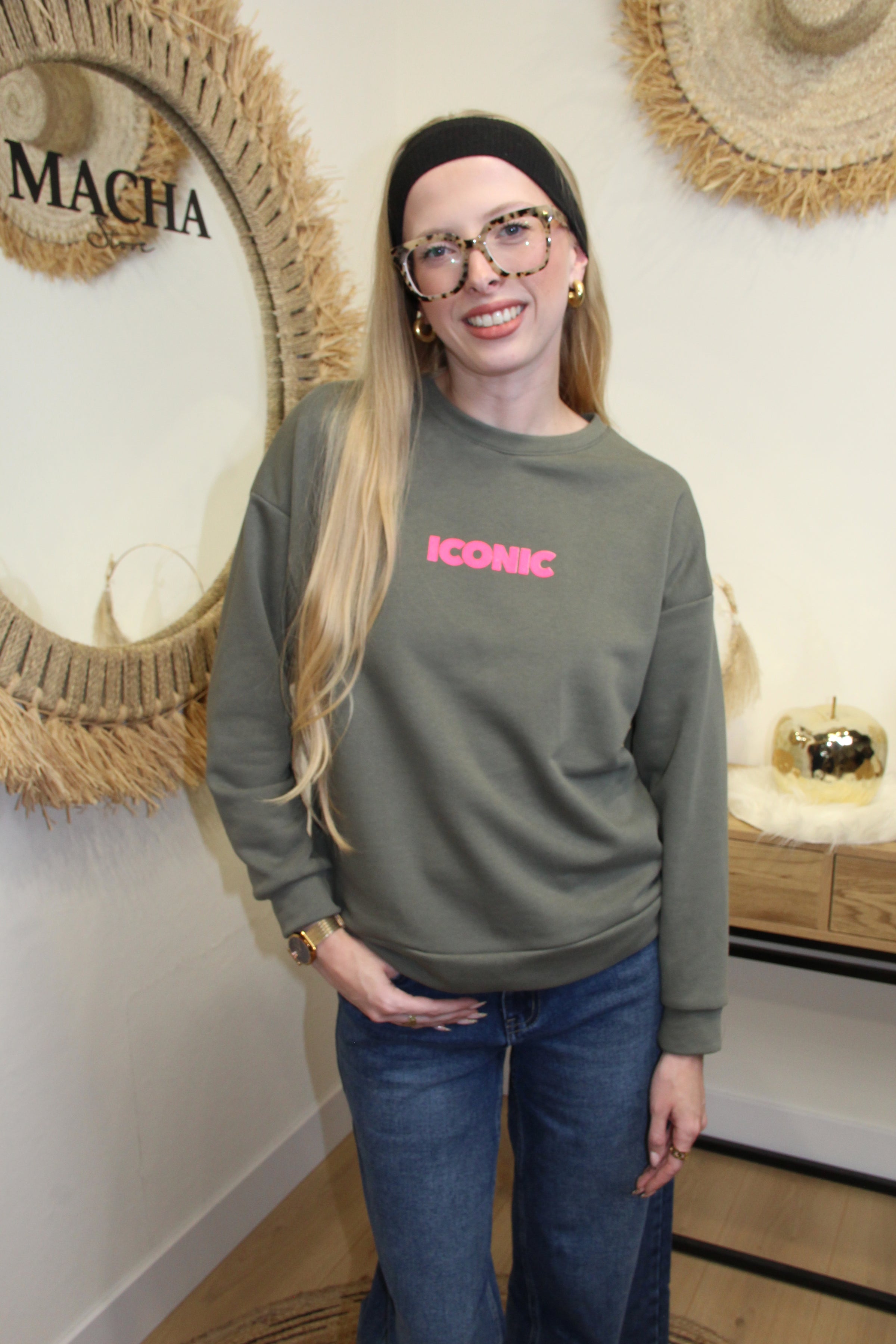 Affirmez votre style avec le sweat ICONIC, une pièce forte et confortable. Son inscription rose fluo tranche avec le kaki profond du tissu, pour une allure casual et moderne à la fois.
