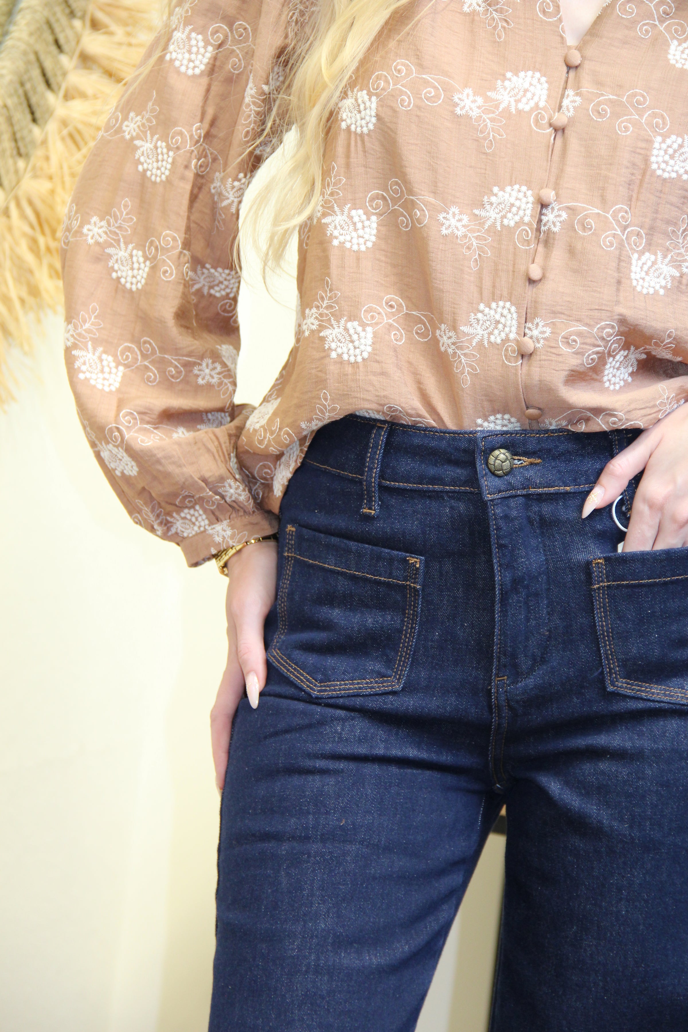 Le jean Ella est une pièce indémodable revisitée avec une coupe moderne. Taille haute, jambes évasées et poches plaquées à l’avant : il allonge la silhouette tout en assurant un confort optimal. Un essentiel chic et rétro à la fois.