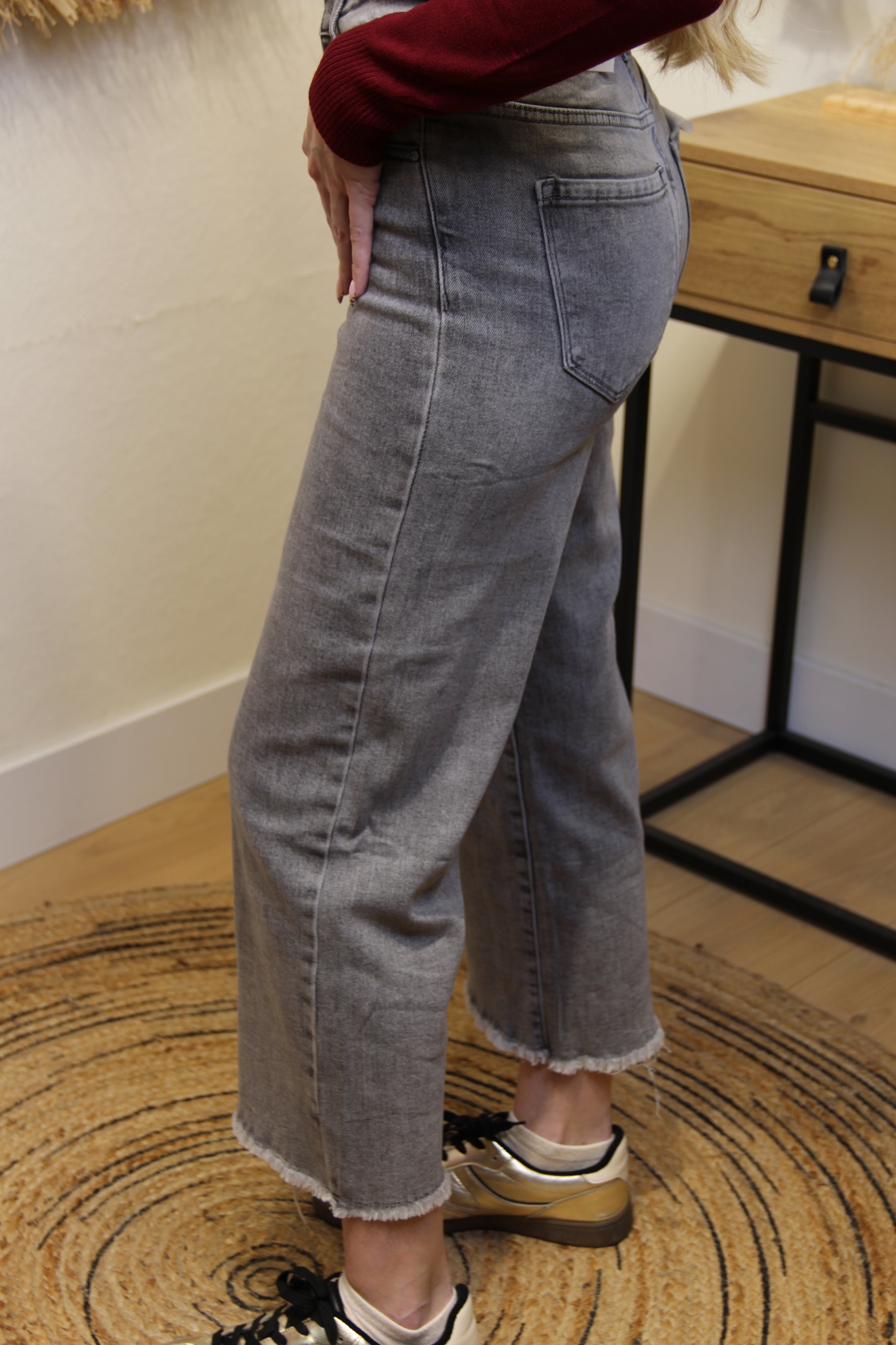 Le jean Nora est une pièce tendance et confortable à la coupe droite légèrement évasée. Son délavage gris foncé et sa finition effilochée en bas lui donnent un style urbain et moderne, parfait pour toutes les saisons.