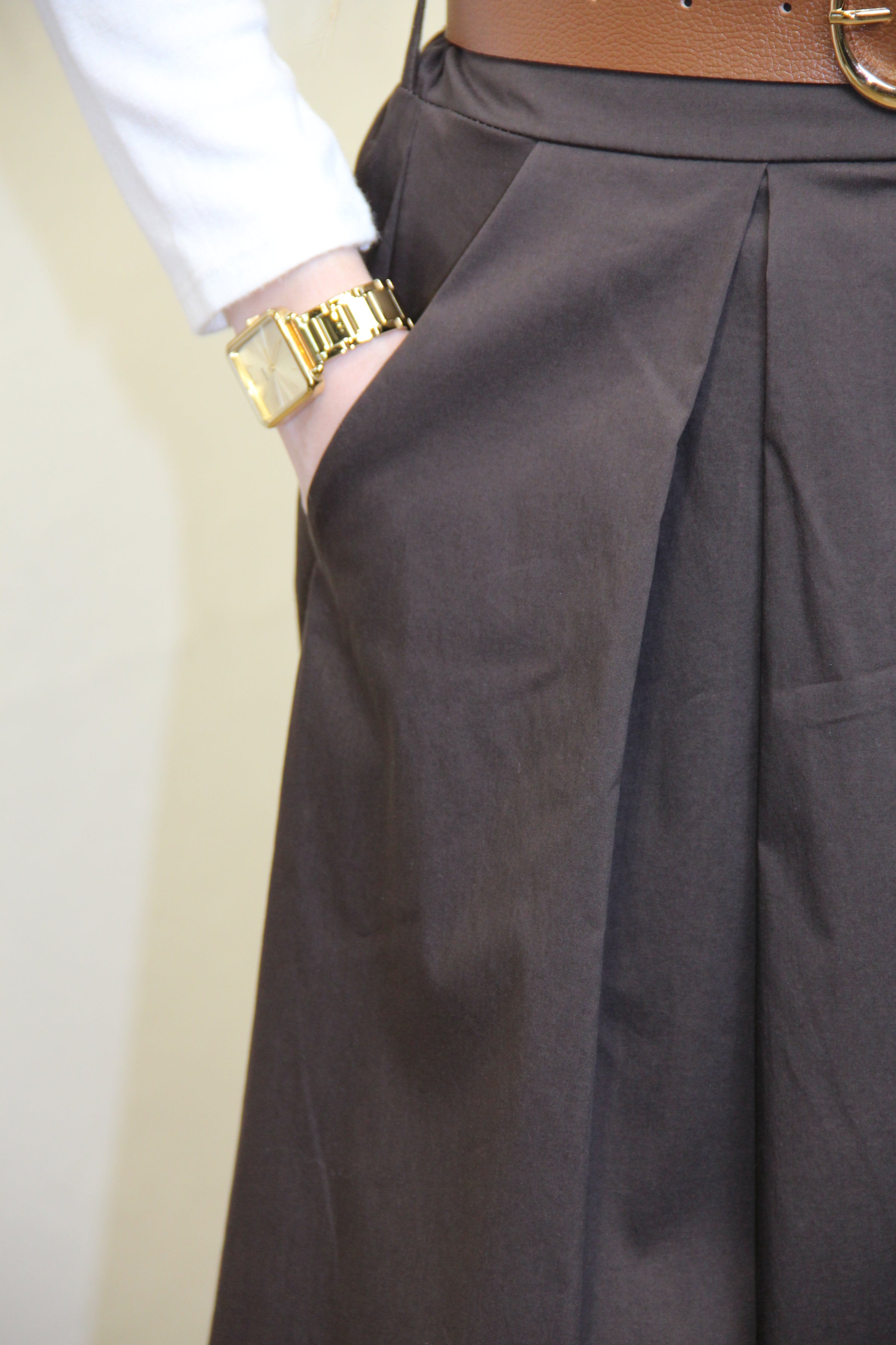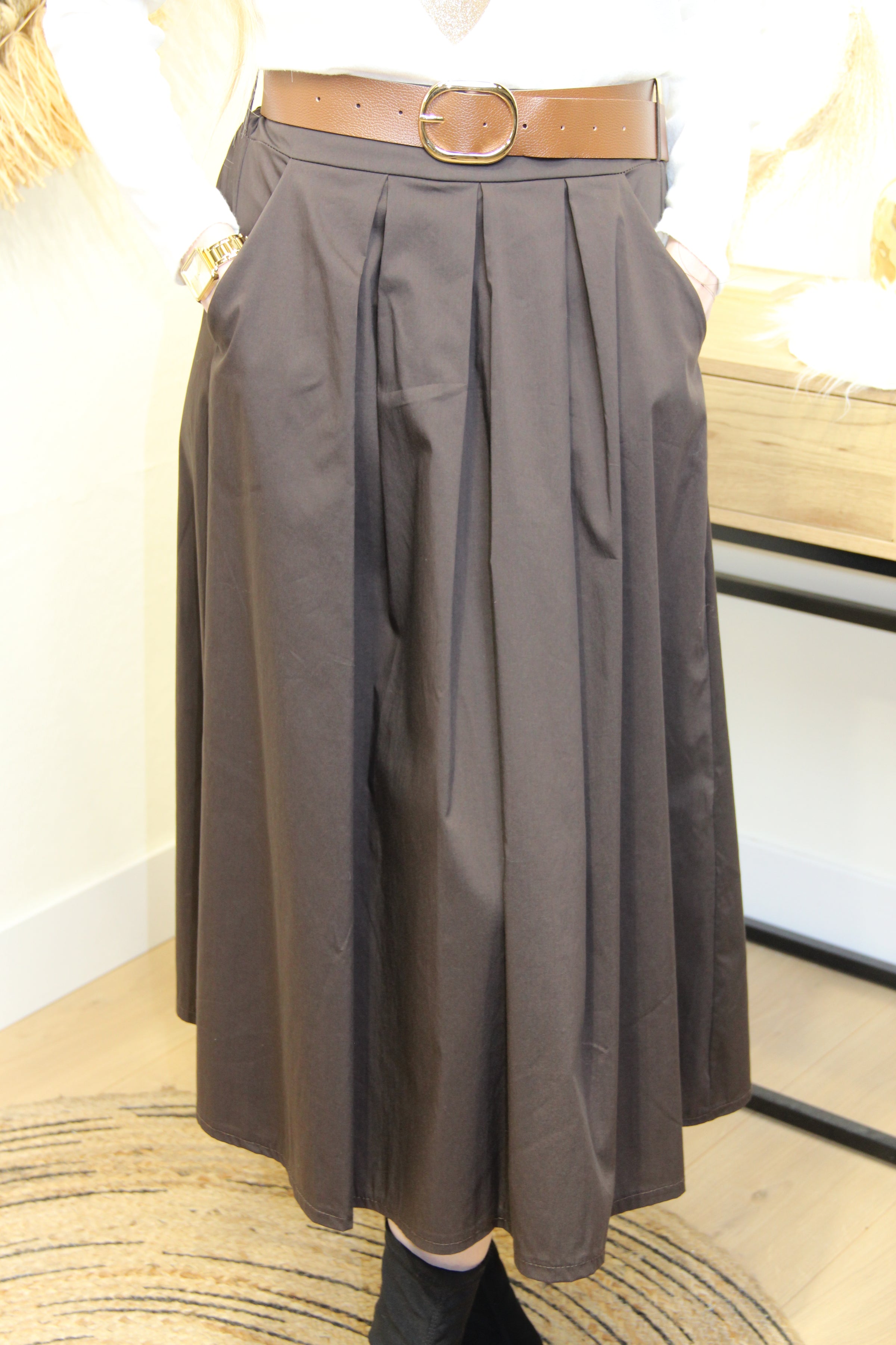 La jupe Élisa chocolat séduit par sa coupe fluide et structurée. Sa teinte profonde et son tombé parfait en font une pièce chic et intemporelle à avoir dans sa garde-robe. À associer avec un pull ou une chemise rentrée pour un style féminin et élégant.