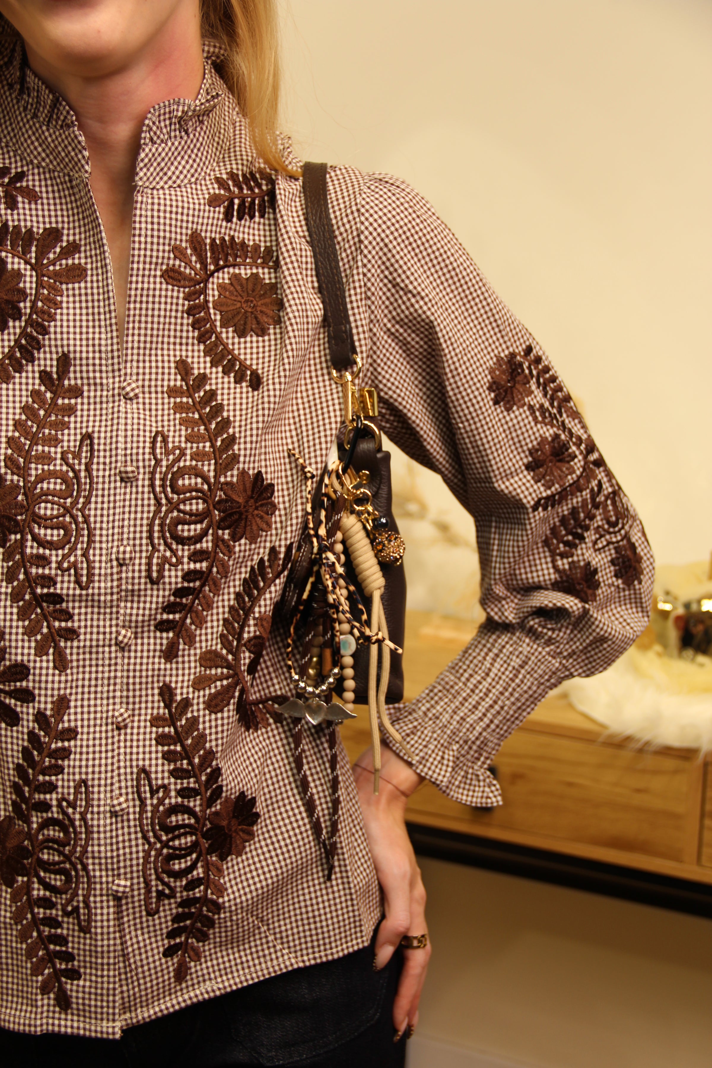 La blouse Mirella est une pièce au charme bohème et raffiné, alliant petits carreaux intemporels à de magnifiques broderies florales chocolat. Elle se distingue par son col mao, sa patte de boutonnage discrète et ses poignets légèrement froncés, parfaits pour structurer la silhouette tout en douceur.