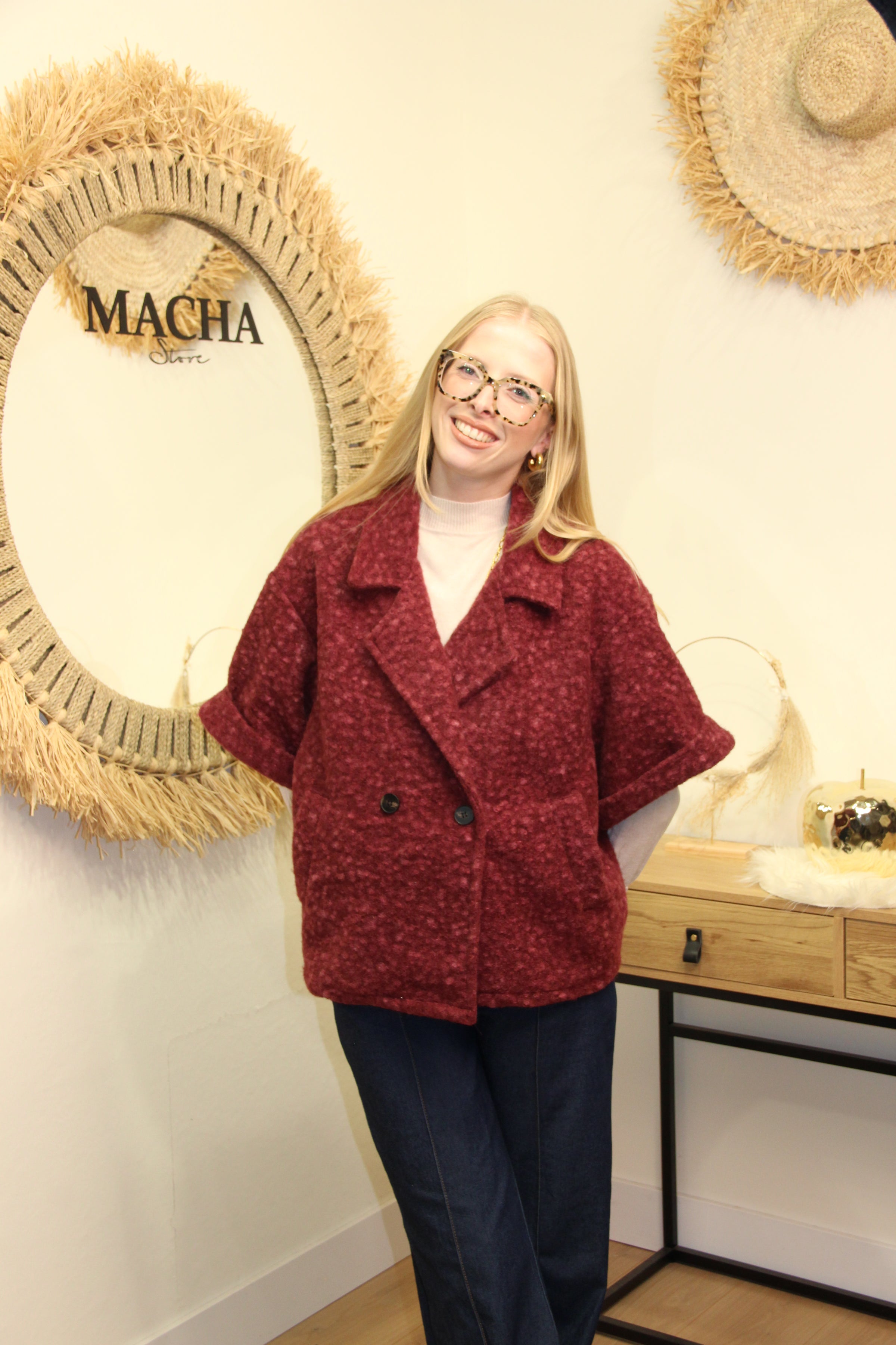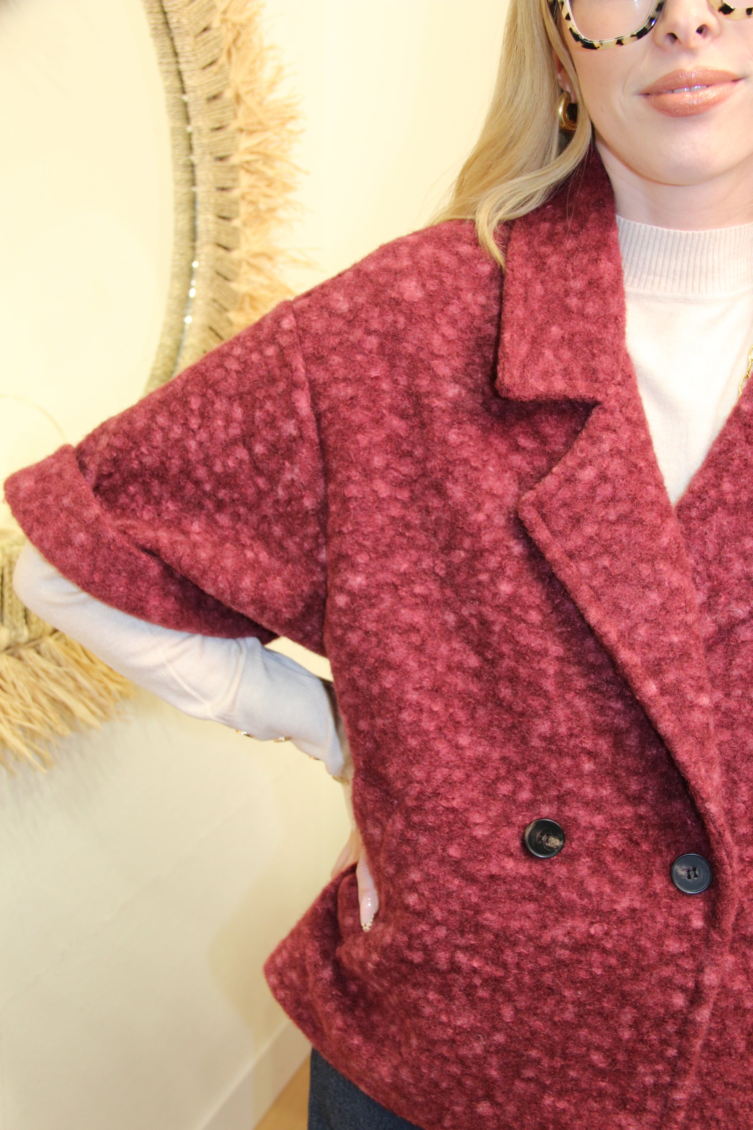 La veste Giulia est une pièce forte au style affirmé. Avec ses manches courtes et sa coupe droite légèrement oversize, elle se porte aussi bien en mi-saison qu’en superposition sur un col roulé. Son motif bicolore discret et sa teinte bordeaux en font un indispensable chic et audacieux.