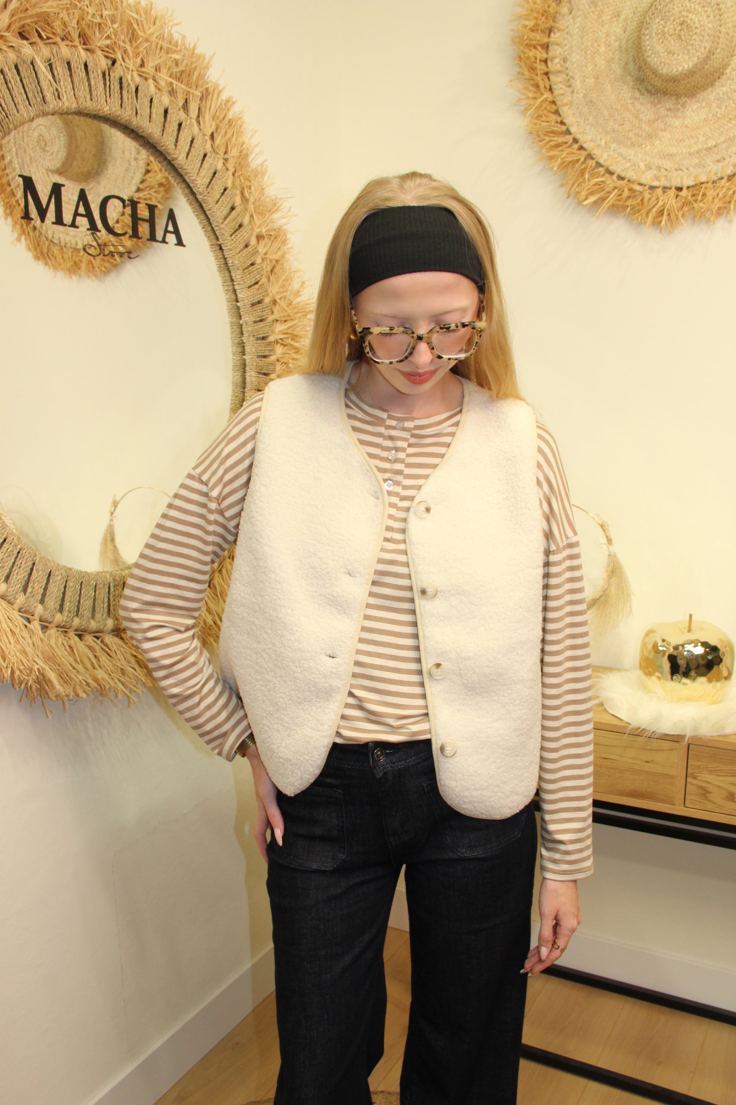 Le gilet sans manches Maïa est la pièce cocooning par excellence. En matière effet laine bouclée, il réchauffe tous vos looks avec douceur et style. À porter sur une chemise, un pull ou une marinière, pour une superposition ultra tendance.