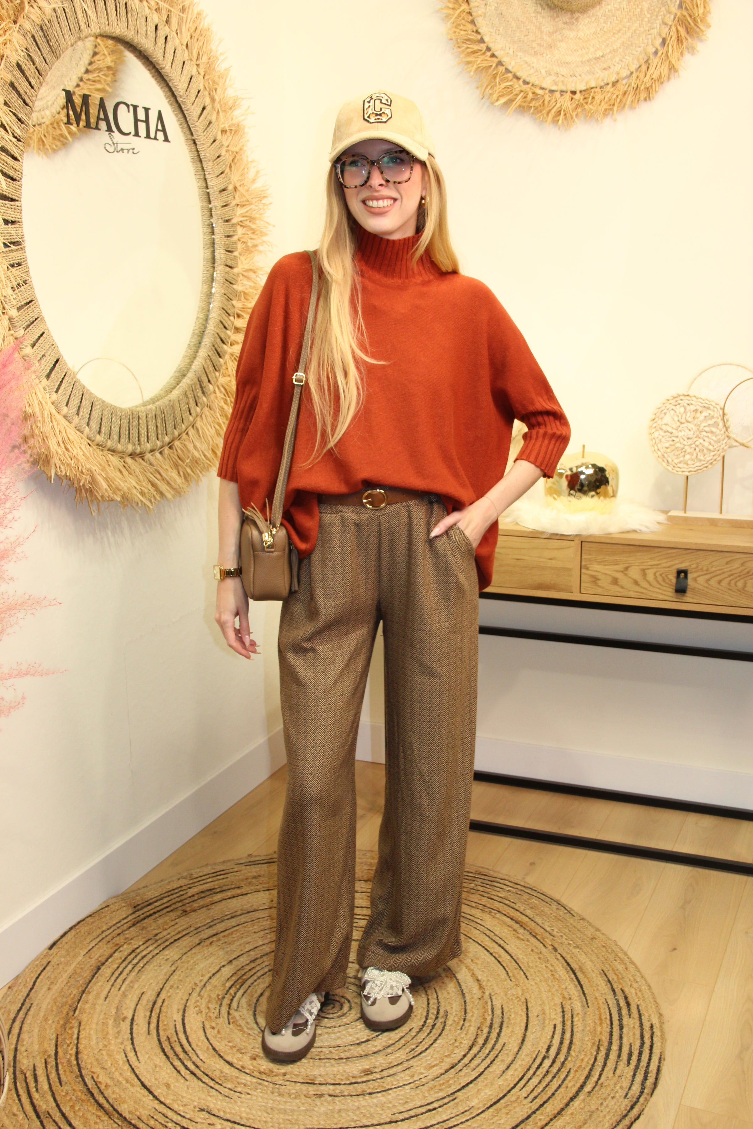 Le pantalon Élise associe élégance et confort grâce à sa coupe fluide et son motif chevron subtil. Taille élastiquée au dos, il s’adapte facilement à toutes les morphologies et se porte aussi bien au bureau qu’en sortie décontractée.