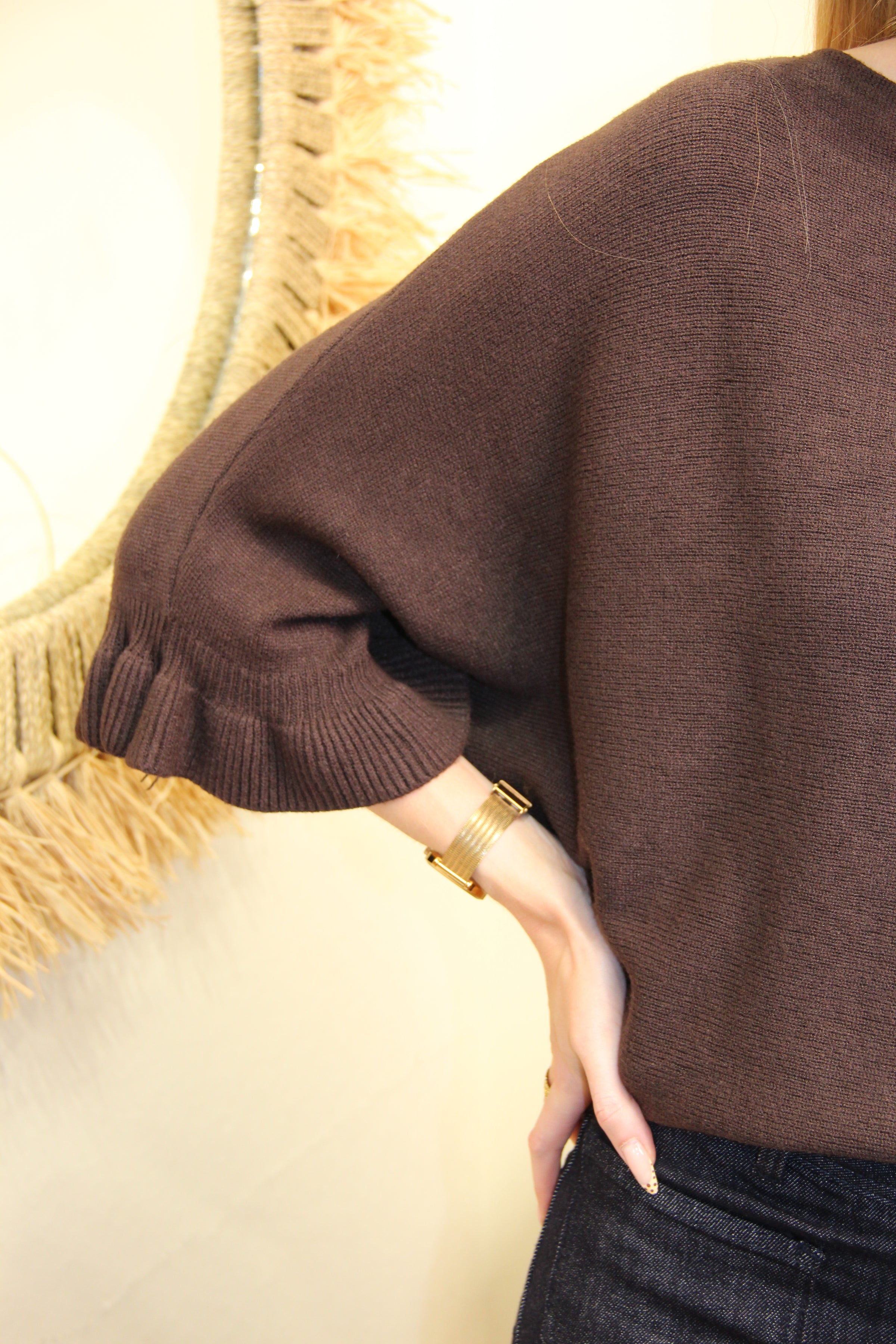 Avec son coloris chocolat profond et sa coupe loose ultra confortable, le pull Clara est un essentiel chic et cosy. Parfait pour réchauffer vos looks avec style, il séduit par ses manches 3/4 bouffantes et son encolure bateau.